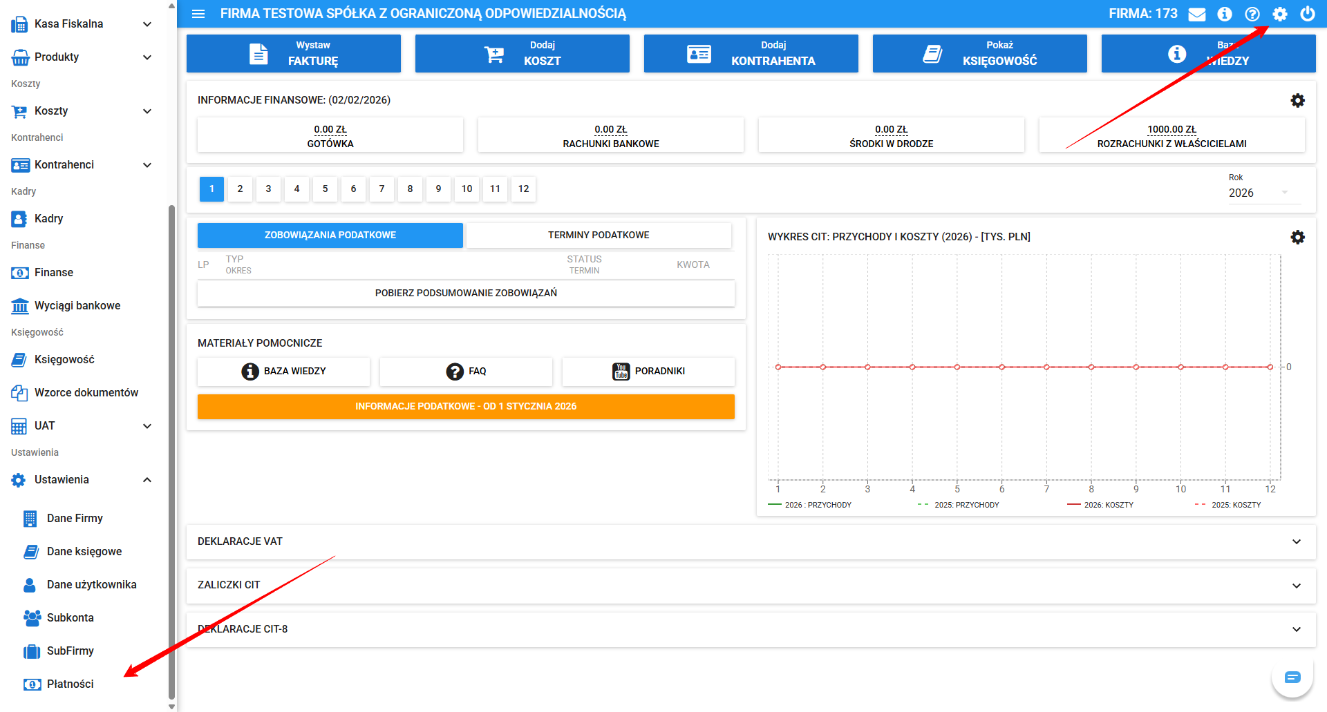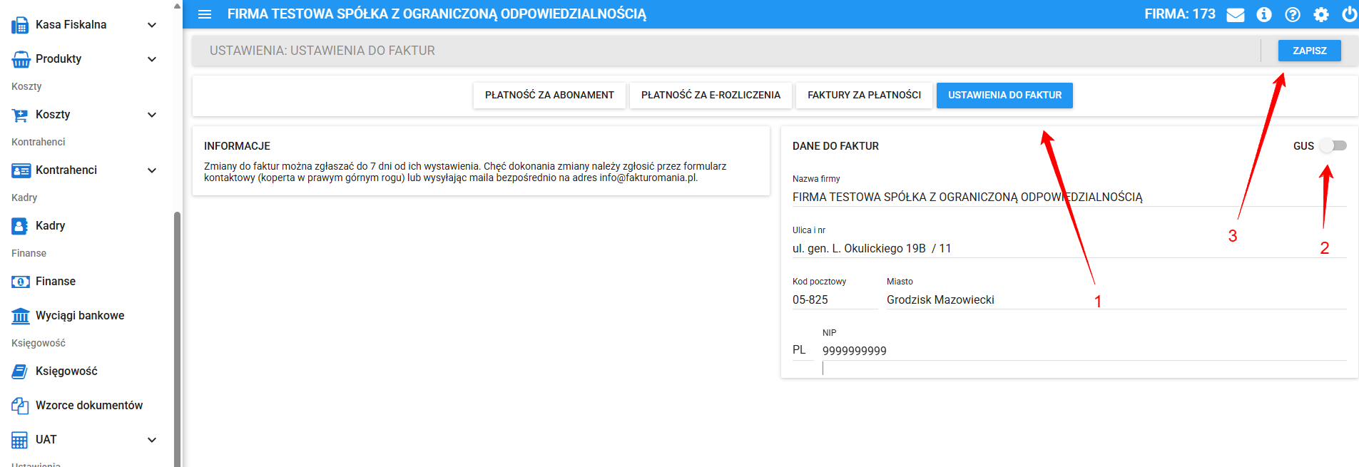 Przed wykonaniem płatności niezbędne jest ustawienie danych podmiotu, na które zostanie automatycznie wystawiona faktura za dokonany zakup. W niniejszym celu należy udać się do zakładki "Ustawienia do Faktur".