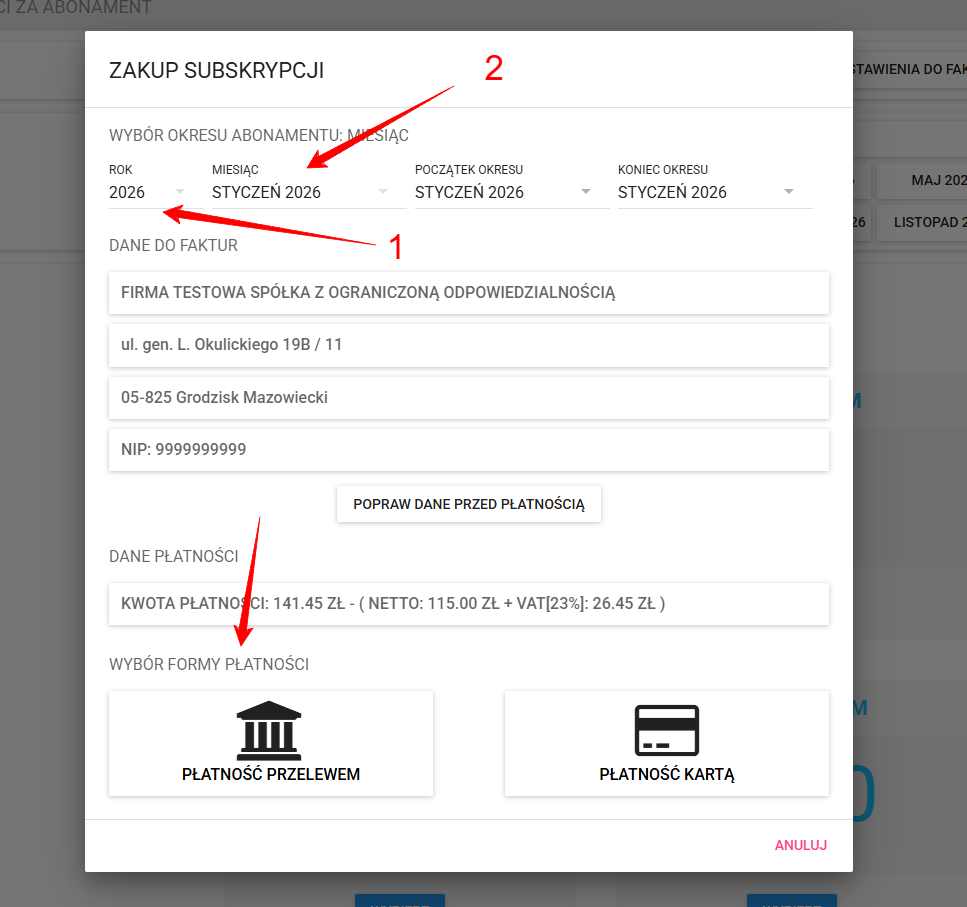 Możliwość zakupu abonamentu aplikacji jest dostępna bezpośrednio po zalogowaniu w systemie oraz po pełnym skonfigurowaniu konta. Konfiguracji konta należy dokonać postępując zgodnie z materiałami pierwszych kroków.