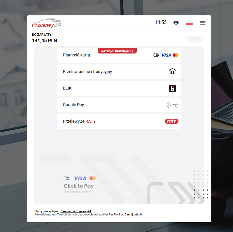 Po wybraniu płatności przelewem zostaniemy przeniesieni do systemu pośrednika płatności, w nim należy postępować zgodnie z przedstawionymi przez niego podpowiedziami.