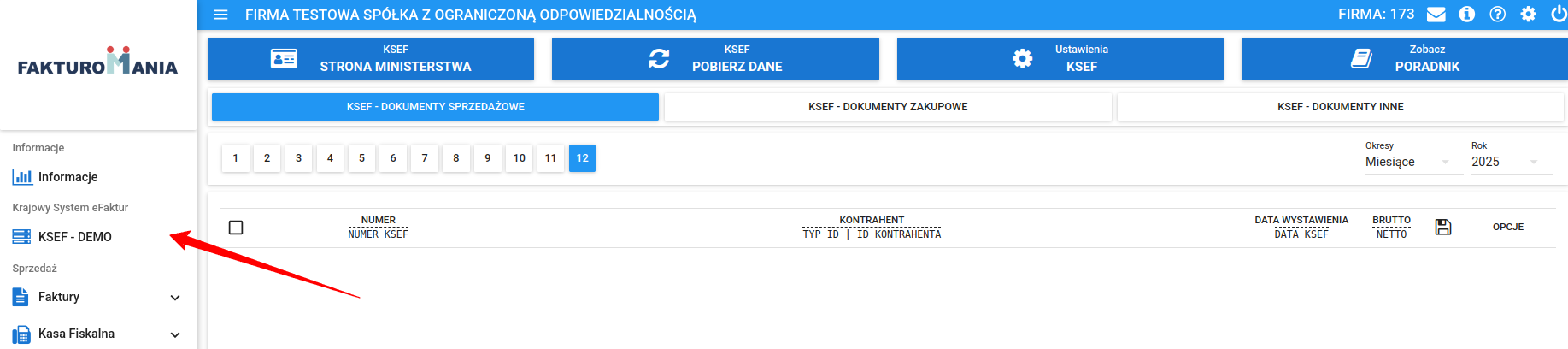 Integracja z KSeF w Fakturomanii dla wymiany dokumentacji bazująca na dotychczasowych danych Ministerstwa Finansów została już przygotowana, podlega również bieżącej aktualizacji z uwagi na ciągłe zmiany wprowadzane przez Ministerstwo. Niniejszy moduł Użytkownikom udostępniony dla działania zostanie wraz z początkiem stycznia 2026r. aktualnie jednak Użytkownicy mogą już znaleźć daną sekcję w lewym menu wybierając "KSeF - DEMO".