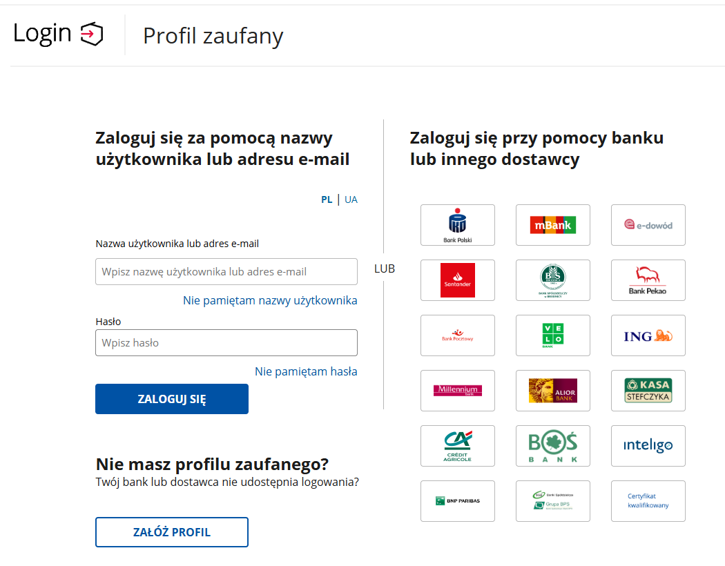 Po wyborze profilu zaufanego zostaniemy przeniesieni najpierw do logowania za pośrednictwem emaila (jeżeli rejestrowaliśmy profil zaufany bez banku) albo banku, w której to części wybieramy konkretną instytucję finansową. Tutaj logujemy się na profil zaufany za pośrednictwem banku i postępujemy zgodnie z instrukcjami instytucji finansowej dla logowania do profilu zaufanego.