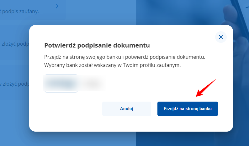 Następnie, po zalogowaniu na profil zaufany, aby złożyć podpis pod żądaniem autoryzacyjnym, należy wybrać "Przejdź na stronę banku" po czym ponownie postępować zgodnie z instrukcjami z instytucji finansowej do podpisu (czyli po zalogowaniu w banku podać kod SMS lub przeklikać autoryzację w aplikacji mobilnej).