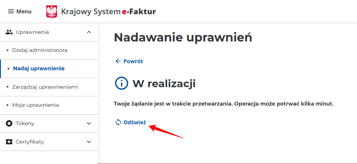 Po wybraniu przycisku zostaniemy przeniesieni do następnej strony, w której pojawi się informacja "W realizacji". Tutaj jeżeli nie pojawi się automatycznie status zakończenia przetwarzania wybieramy "Odśwież".