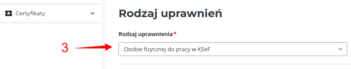 Tak też w przypadku naszej osoby, czyli osoby zarządzającej lub prowadzącej działalność wybieramy w polu Rodzaj Uprawnień wariant "Osobie fizycznej do pracy w KSeF".