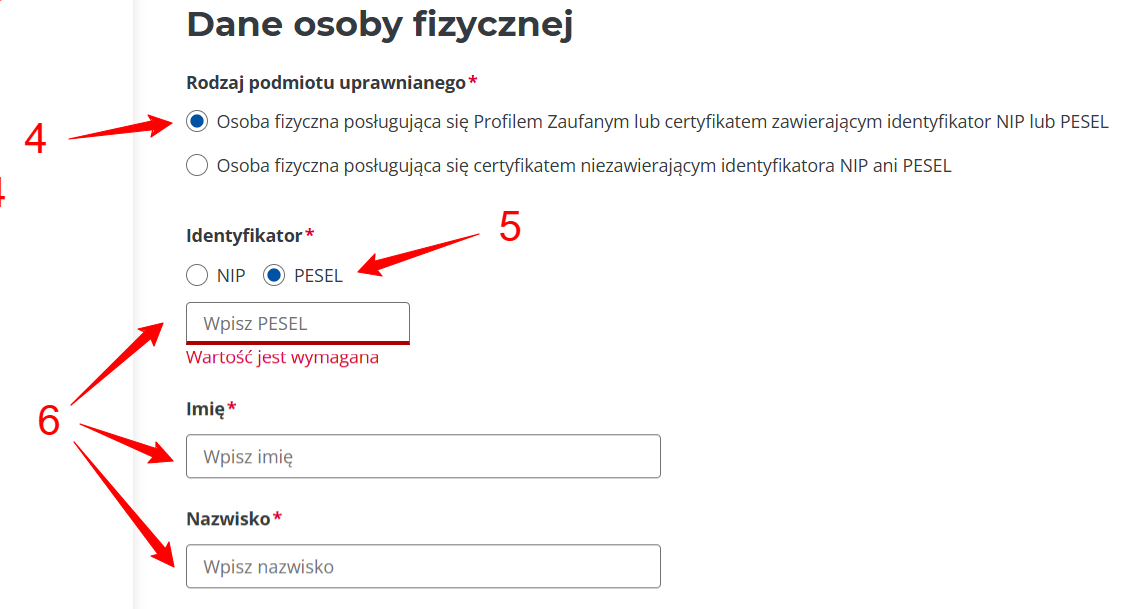 Po wyborze danej opcji rozwinie się sekcja dane osoby fizycznej, tutaj jako rodzaj podmiotu uprawnianego wybieramy "Osoba fizyczna posługująca się Profilem Zaufanym lub certyfikatem zawierającym identyfikator NIP lub PESEL".