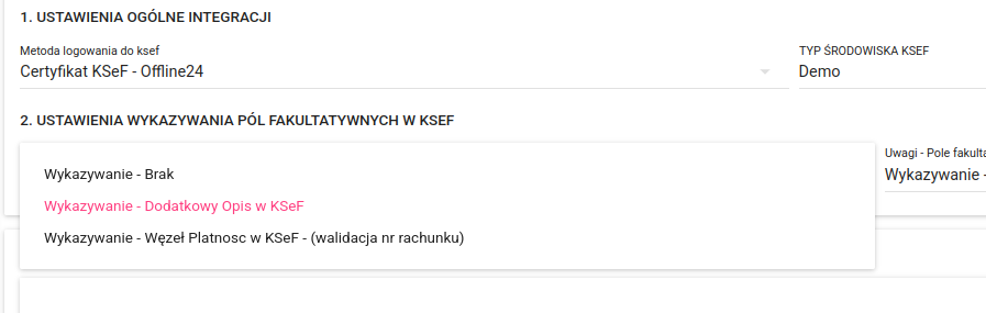 Kolejnym krokiem jest konfiguracja ustawień sposobu wykazywania pól faktultatywnych w KSeF, nie wszystkie bowiem pola są konieczne dla przekaznia faktury przez Krajowy System eFaktur. Takimi najważniejszymi polami fakultatywnymi (najczęściej również stosowanymi w praktyce) są płatności oraz uwagi. Oczywiście każdy z wariantów należy technicznie sprawdzić oraz wybrać dla siebie najbardziej pasujący, wizualnie bowiem nieznacznie się od siebie różnią.