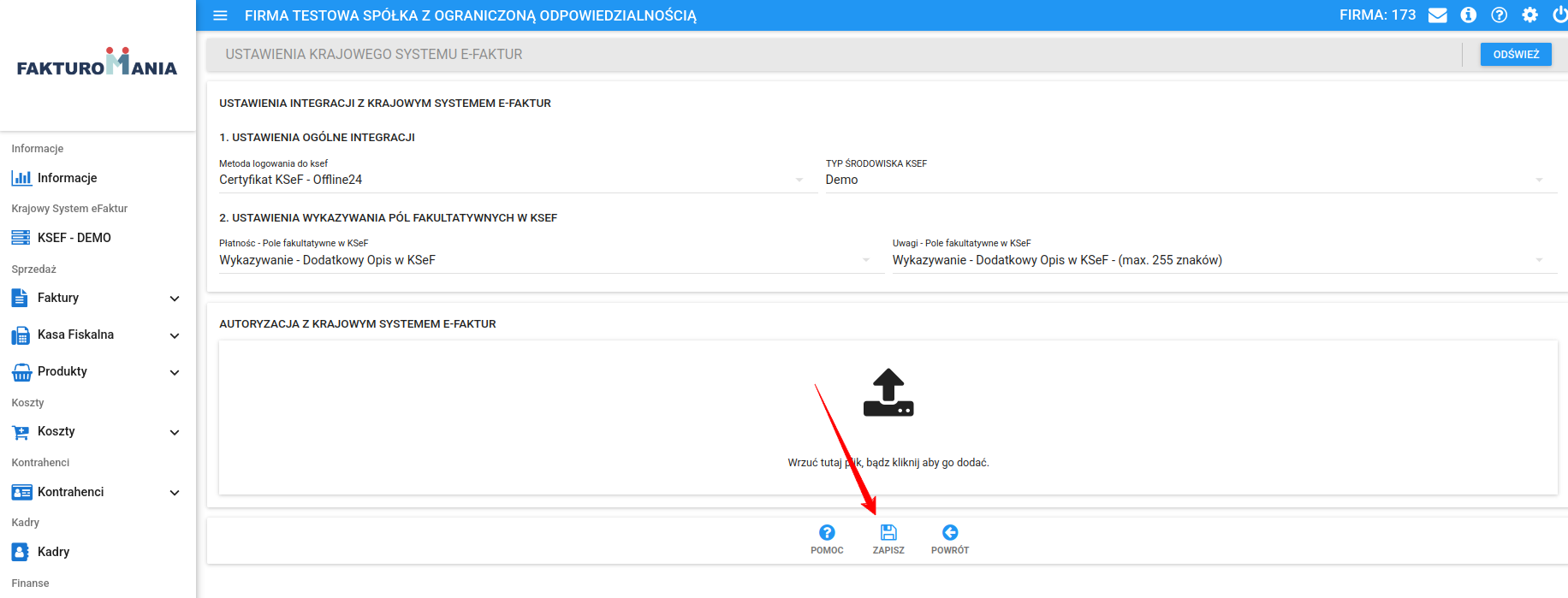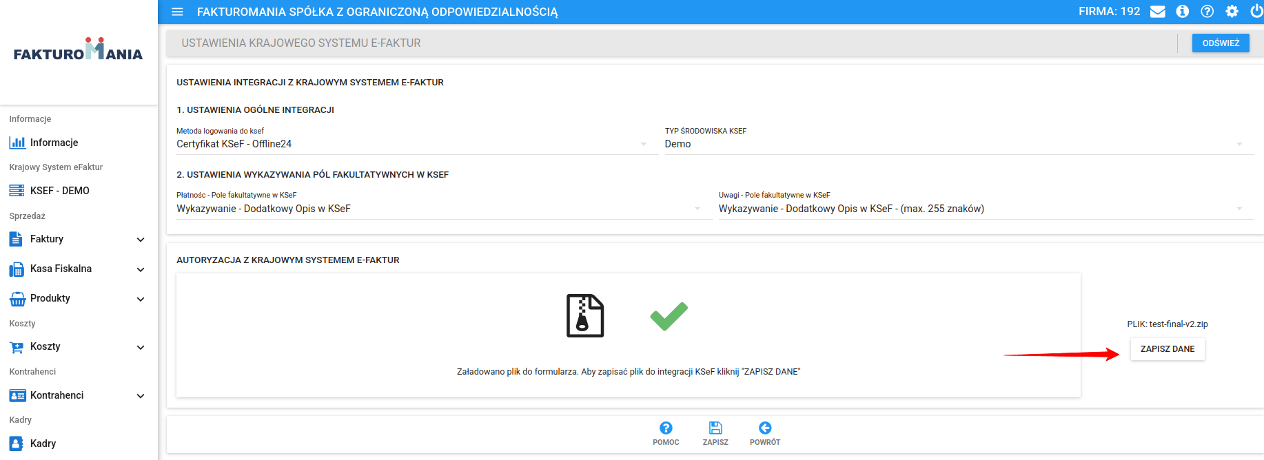 Po niniejszej konfiguracji można już podjąć próbę przekazania danych do wybranych środowisk Krajowego Systemu eFaktur.