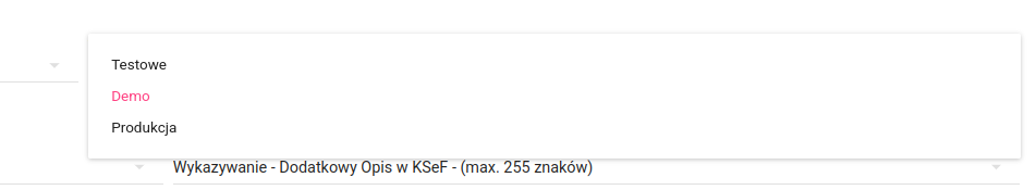 b) Typ środowiska KSeF, w którym możemy wybrać odpowiednie środowisko dla wymiany informacji, o których to środowiskach pisaliśmy w pkt II niniejszej instrukcji. Wyróżniamy środowisko Testowe, Demo oraz Produkcyjne (które będzie działać tylko od 1 lutego 2026r.).