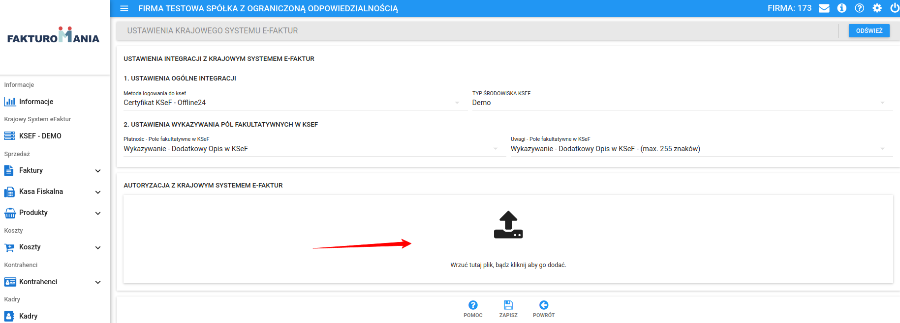 6) Gdy mamy pobrane certyfikaty przystępujemy do konfiguracji Fakturomanii z Krajowym Systemem eFaktur – takie certyfikaty w systemie wprowadzamy zzipowane w module Krajowego Systemu eFaktur w sekcji "Ustawienia KSeF" zgodnie z instrukcją niniejszego materiału.
