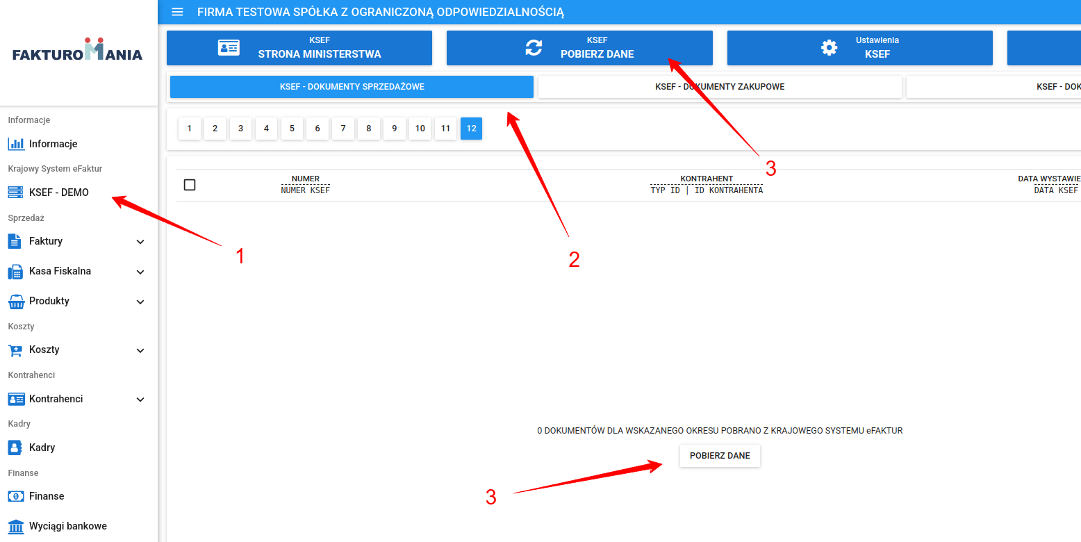 b) Pobierania listy faktur sprzedażowych z KSeF dokonujemy z modułu Krajowego Systemu eFaktur wybierając "KSeF - Dokumenty Sprzedażowe", a następnie "Pobierz dane". Teraz w systemie możemy mieć w jednym miejscu wszystkie faktury, na tym etapie prac brak jest możliwości importu faktur sprzedaży z panelu KSeF do listy faktur.