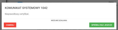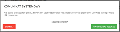 Jeżeli skompresowany plik uległ uszkodzeniu podczas dokonywanej czynności zipowania, albo nie jest kompletny (przykładowo pominięto w nim któryś z certyfikatów lub plików), pojawi się komunikat Nie udało się wczytać pliku ZIP. Plik jest uszkodony albo nie został w całości przesłany.