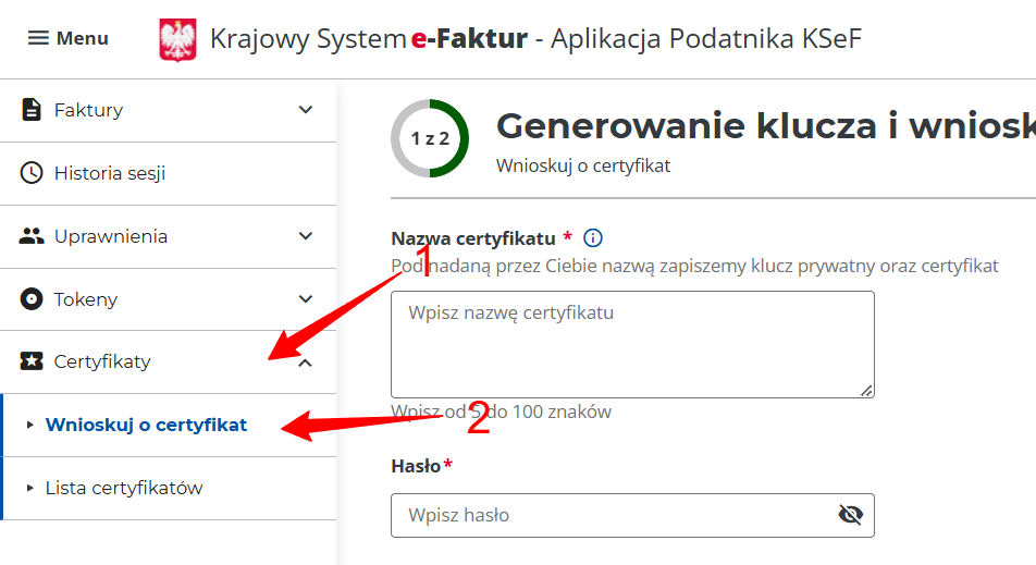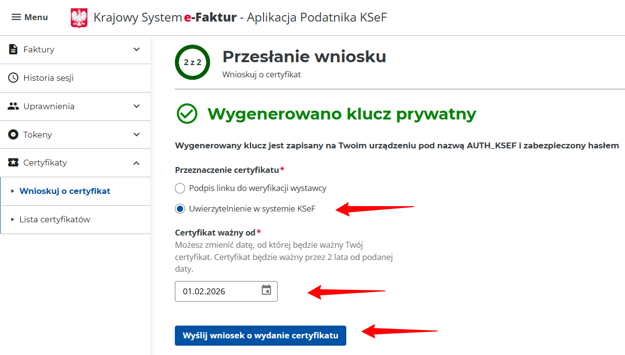 2) Generowanie klucza i złożenie wniosku o wydanie certyfikatów