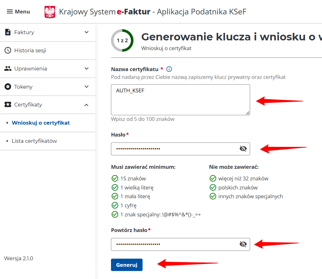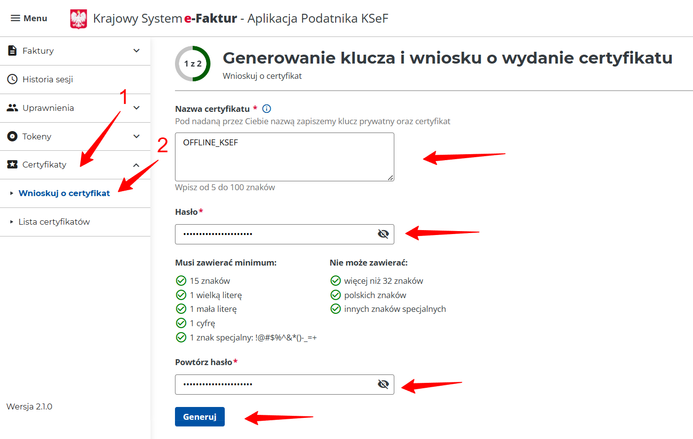 III. Generowanie Certyfikatów w Aplikacji Podatnika KSeF