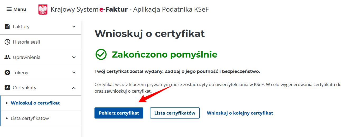 Po tych czynnościach powinniśmy mieć możliwość pobrania następnego pliku certyfikatu uwierzytelniającego w KSeF. Zapisujemy go w folderze KSEF_MCU_CERTYFIKATY.