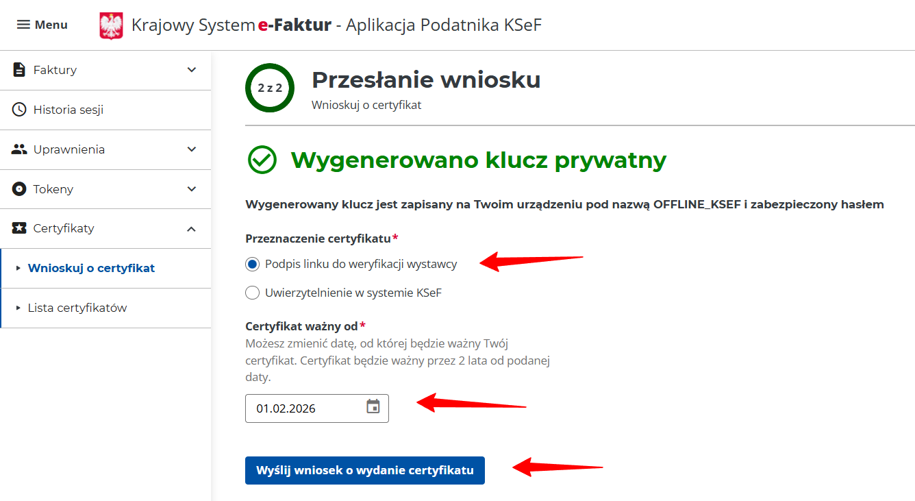 2. Certyfikat służący wysyłce faktur w trybie offline