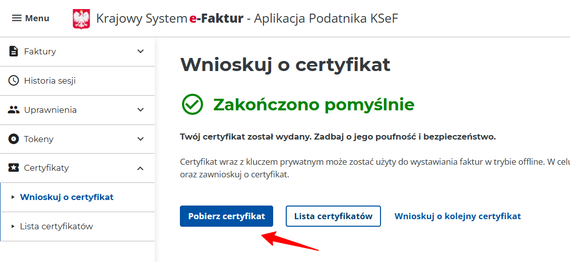 Po tych czynnościach powinniśmy mieć możliwość pobrania następnego pliku certyfikatu dla wysyłki faktur offline w KSeF. Zapisujemy go w folderze KSEF_MCU_CERTYFIKATY.
