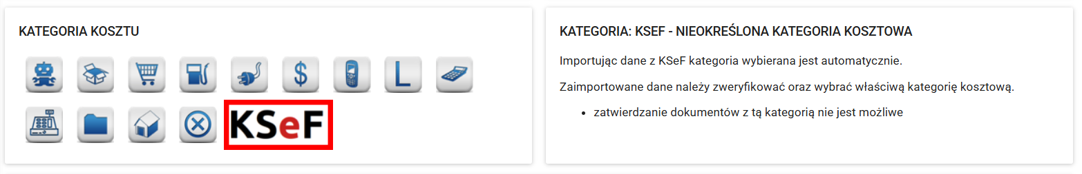Faktury znajdujące się na liście dokumentów zakupowych KSeF można zaimportować do listy kosztów przez funkcję Import. Takiemu zaimportowanemu kosztowi zostanie przyporządkowana specjalna kategoria kosztowa "KSeF", którą należy natępnie zaktualizować.